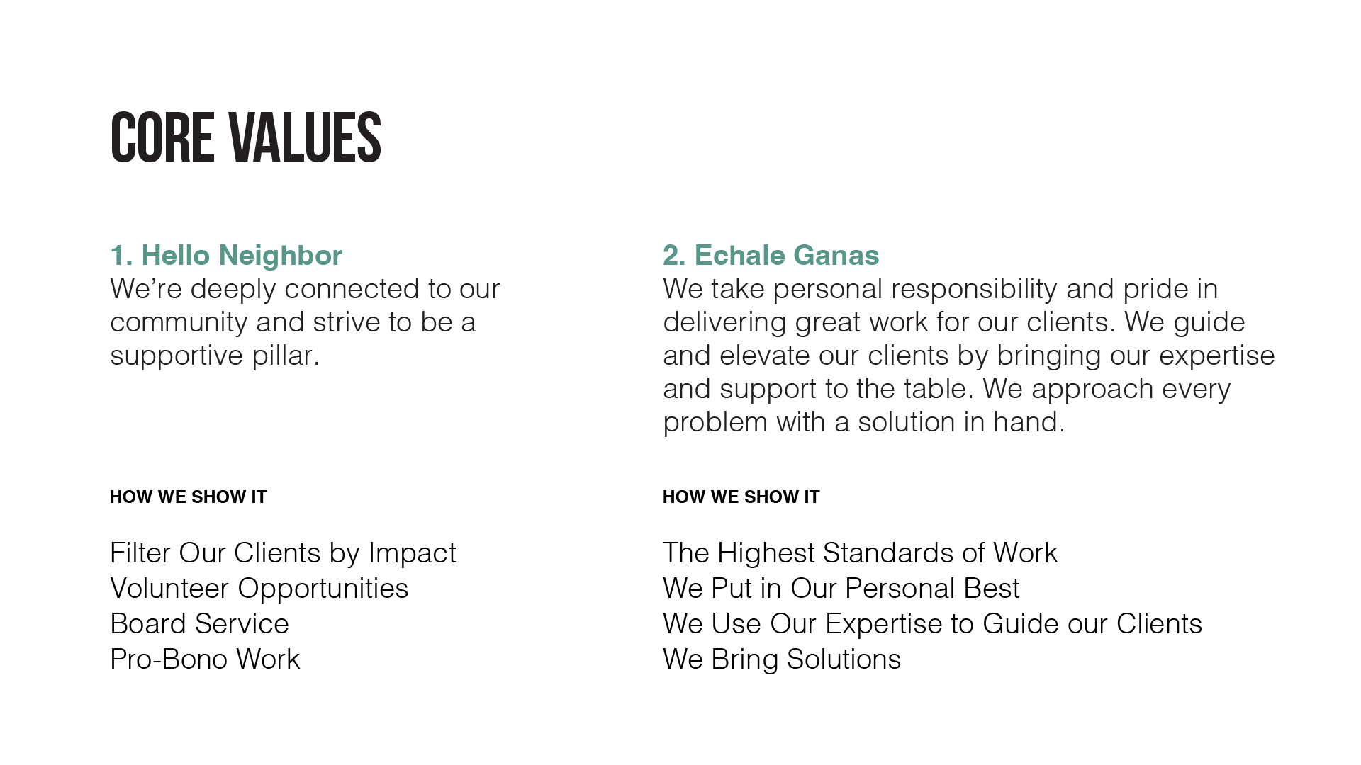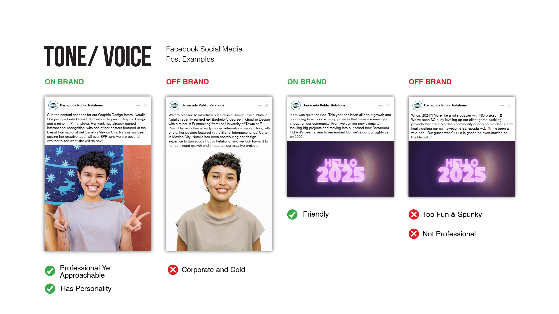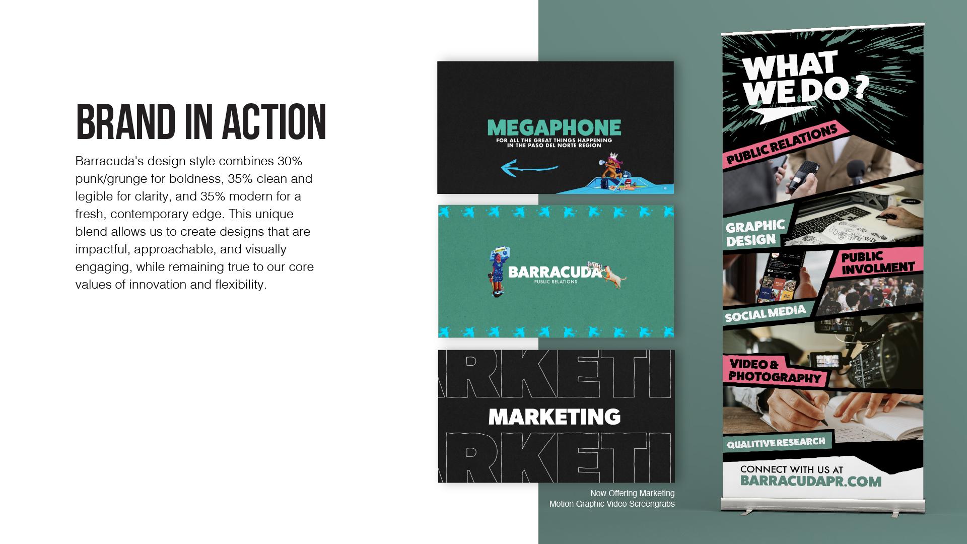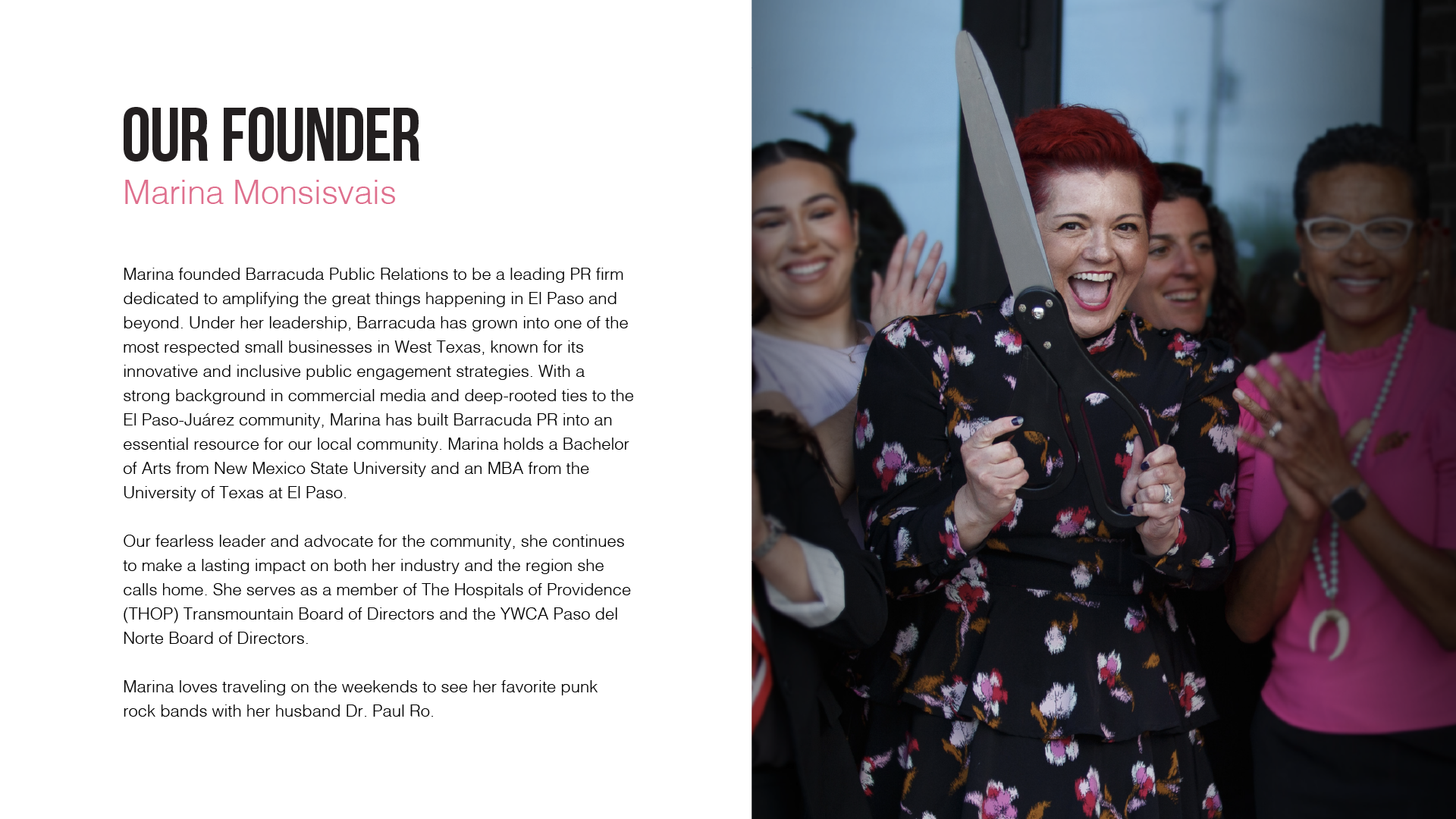 As Creative Director at Barracuda PR—El Paso’s premier public relations firm—I led the agency through a full Brand Strategy process to define who we are, what we do, and how we differentiate ourselves. This meant crafting a purpose, vision, and mission statement, defining core values, developing audience personas, conducting a competitive analysis, and refining our positioning strategy to stand out in the hearts of our customers.